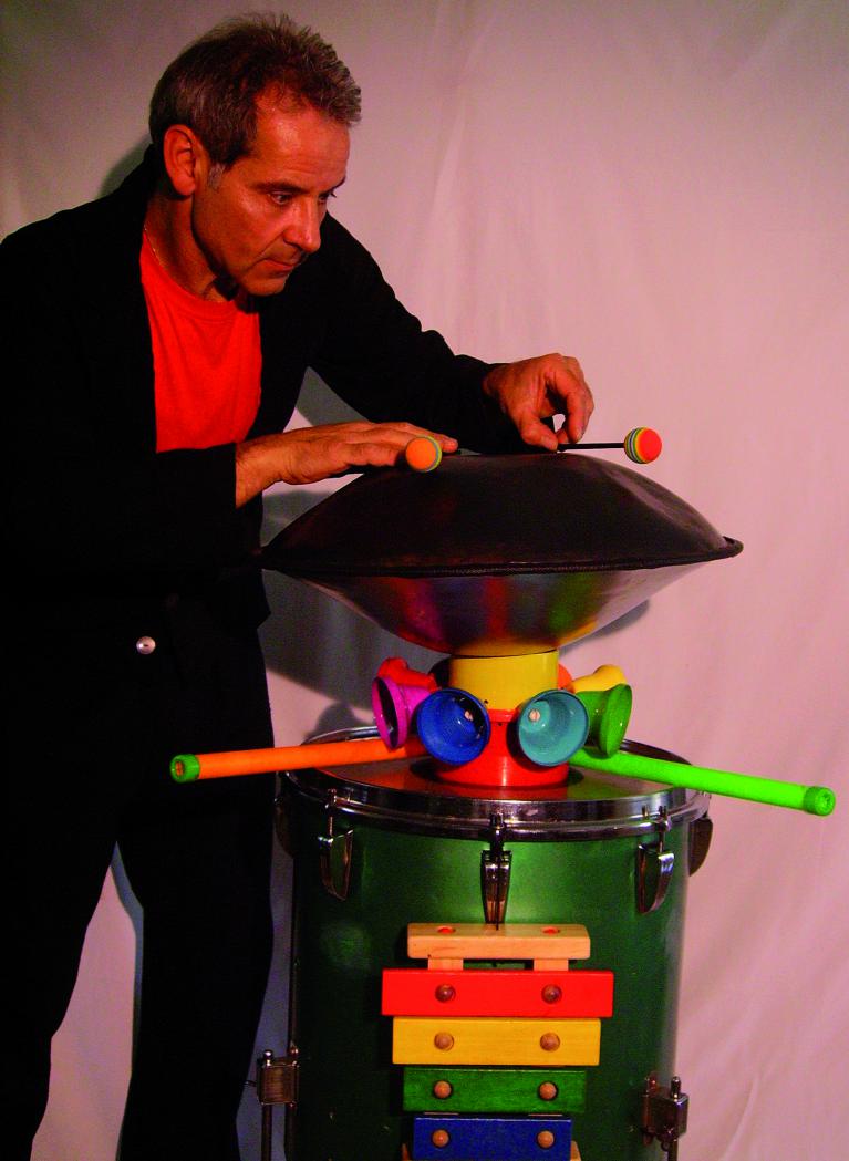 Ses instruments racontent des histoires dans des langues mystérieuses, deviennent sculptures et personnages, toupie aux sons surprenants. Ses sifflets nous font rire, les notes cristallines du Hang accompagnent une chanson, son tambour nous emporte dans une samba endiablée, quelques bulles traversent une berceuse italienne. Au fil du spectacle se construit un drôle de bonhomme...
